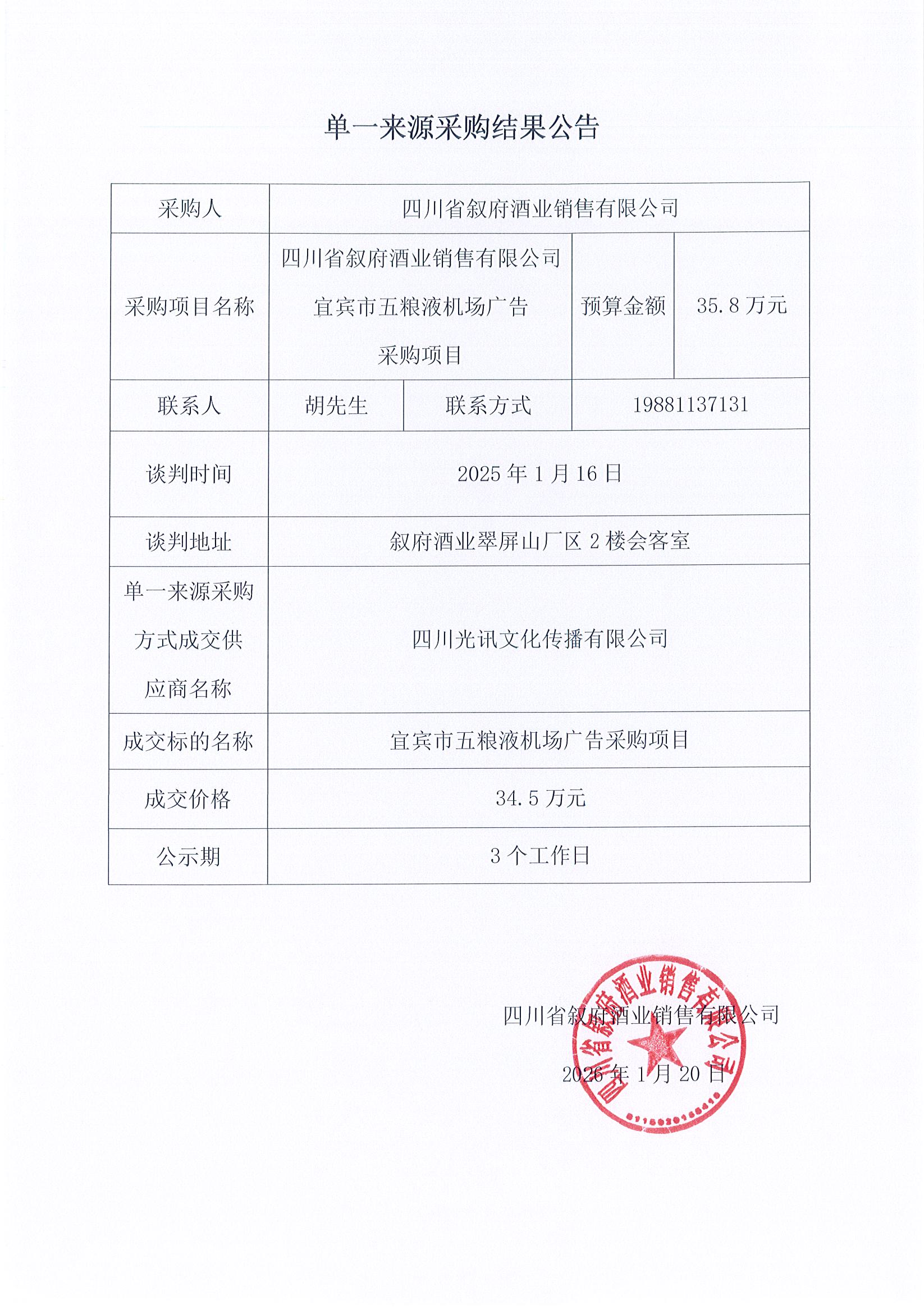 四川省敘府酒業(yè)銷售有限公司宜賓市五糧液機(jī)場廣告采購項(xiàng)目單一來源采購結(jié)果公示公告