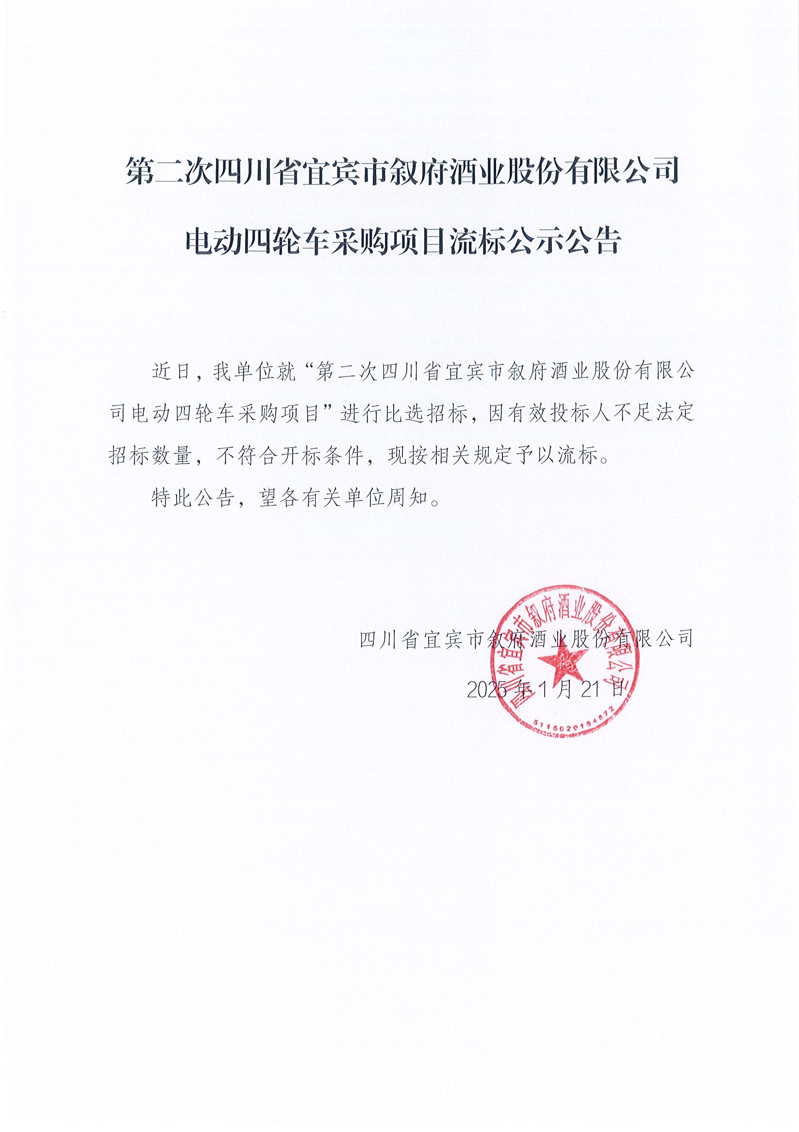 第二次四川省宜賓市敘府酒業(yè)股份有限公司電動四輪車采購項(xiàng)目流標(biāo)公示公告