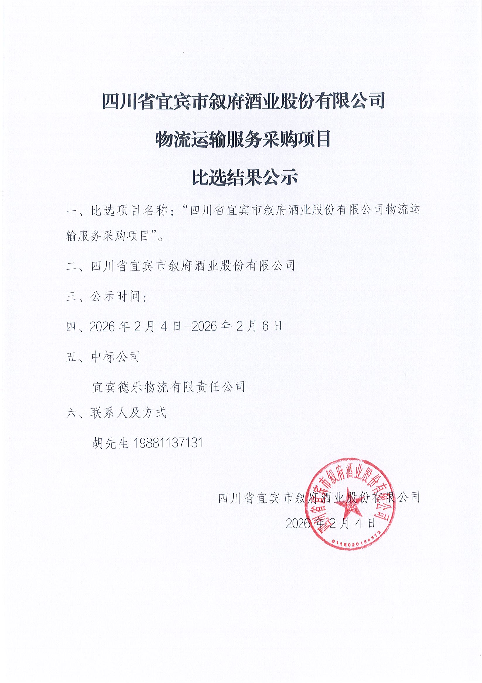 四川省宜賓市敘府酒業(yè)股份有限公司物流運(yùn)輸服務(wù)采購項(xiàng)目比選結(jié)果公示公告