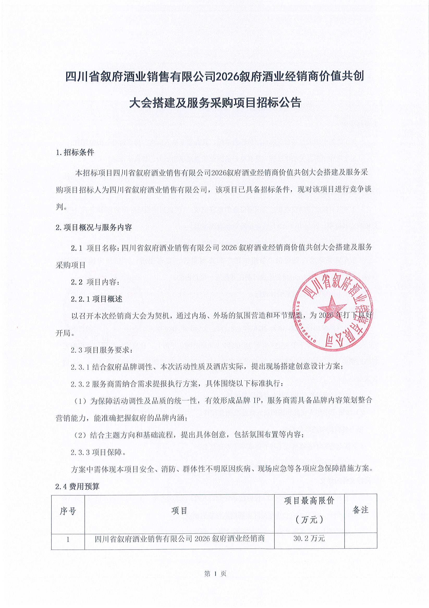 四川省敘府酒業(yè)銷售有限公司2026敘府酒業(yè)經(jīng)銷商價值共創(chuàng)大會搭建及服務(wù)采購項(xiàng)目競爭談判公告
