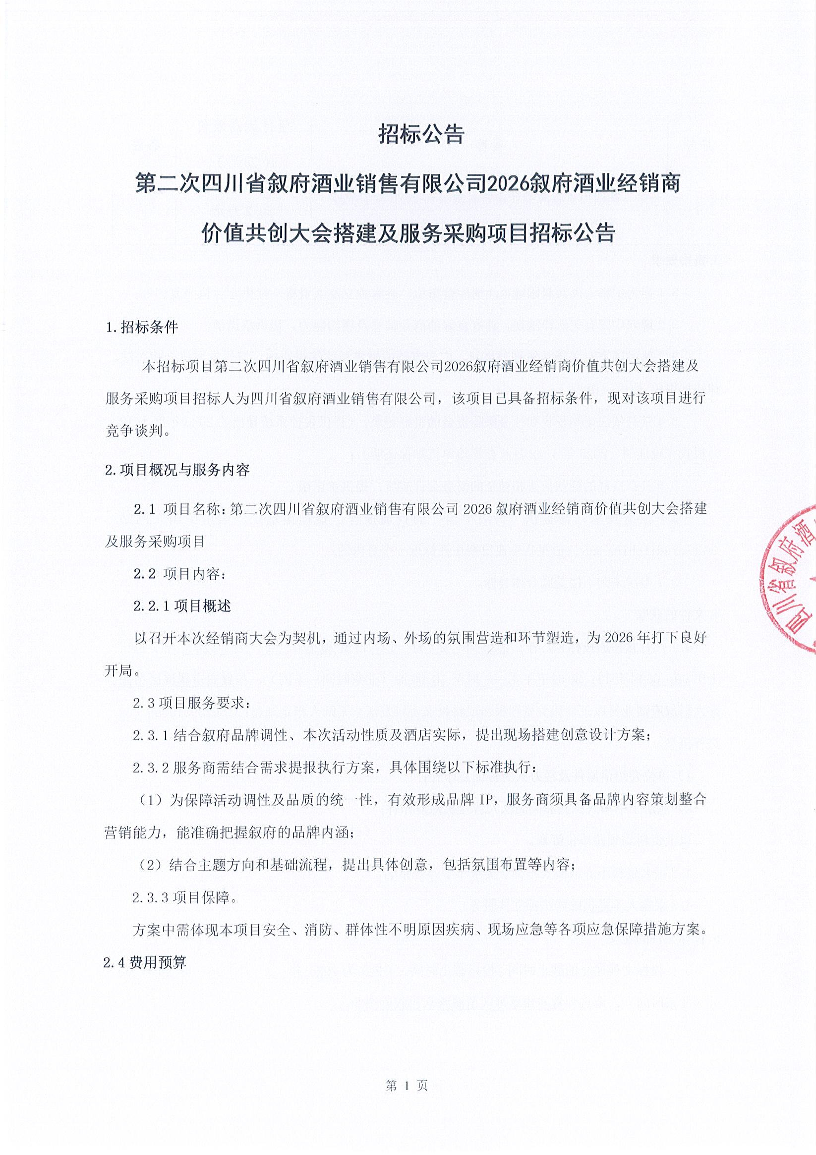第二次四川省敘府酒業(yè)銷售有限公司2026敘府酒業(yè)經(jīng)銷商價值共創(chuàng)大會搭建及服務(wù)采購項(xiàng)目競爭談判招標(biāo)公告