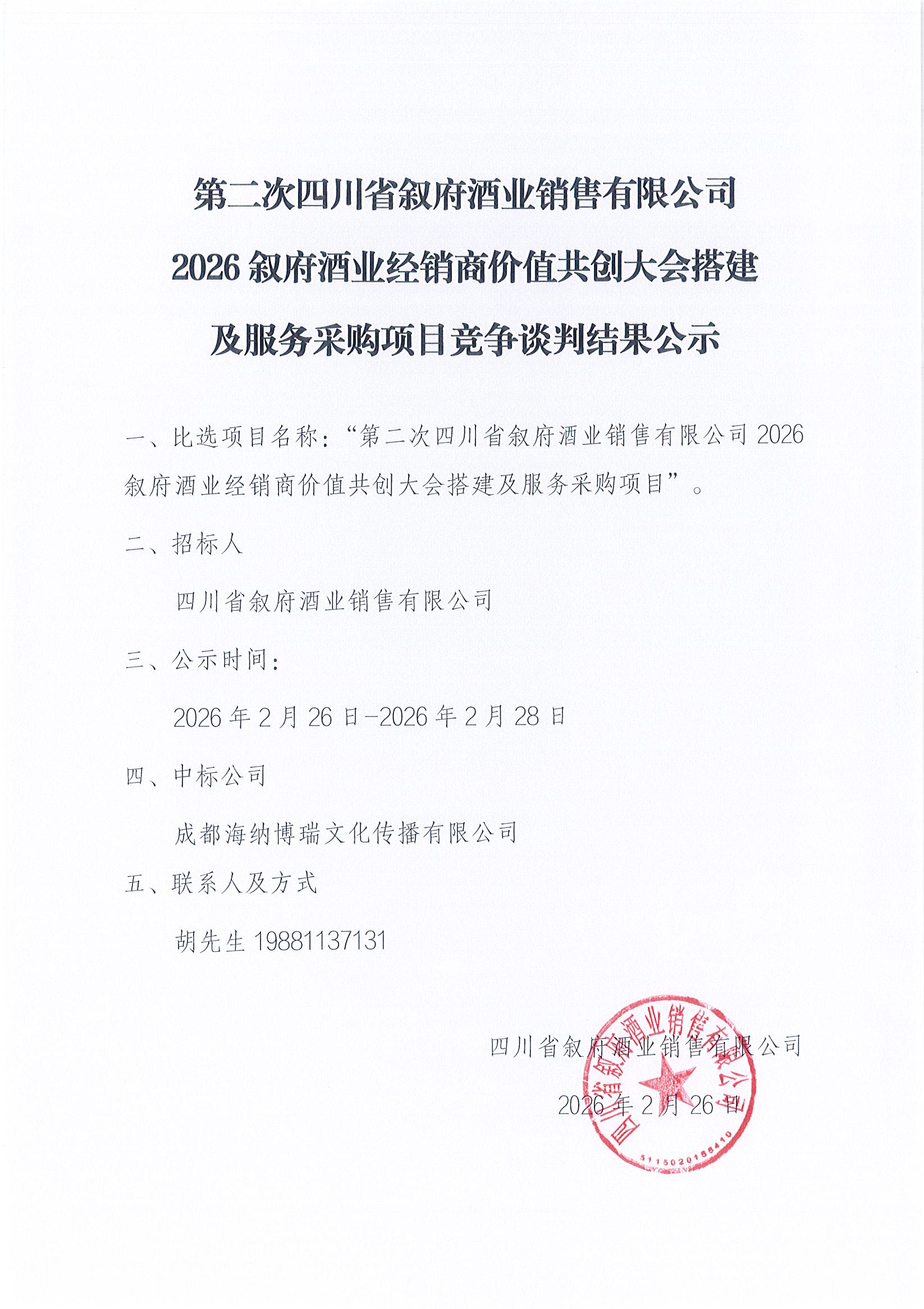 第二次四川省敘府酒業(yè)銷售有限公司2026敘府酒業(yè)經(jīng)銷商價值共創(chuàng)大會搭建及服務(wù)采購項(xiàng)目競爭談判結(jié)果公示