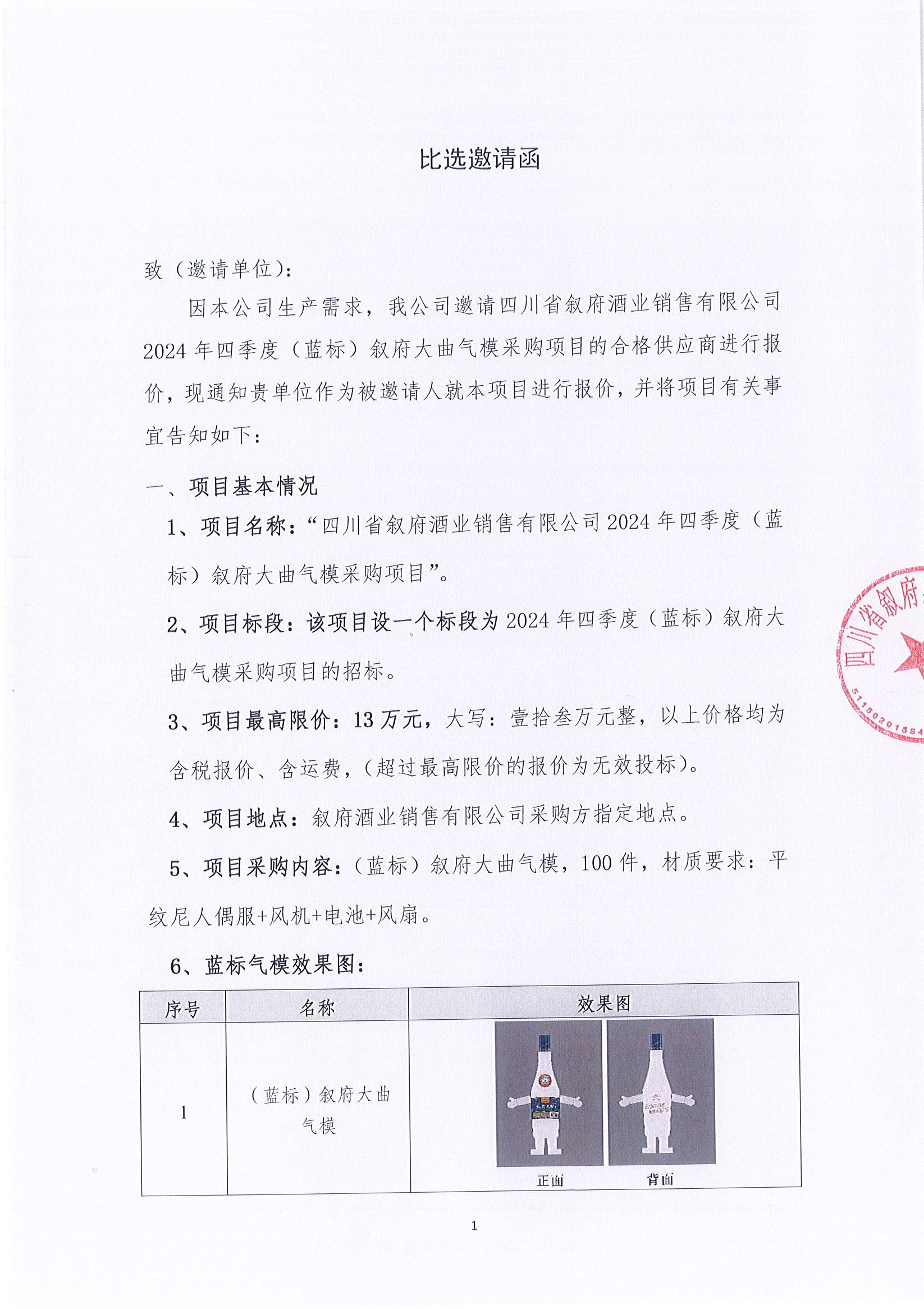 四川省敘府酒業(yè)銷售有限公司2024年四季度(藍標)敘府大曲氣模采購項目比選公告