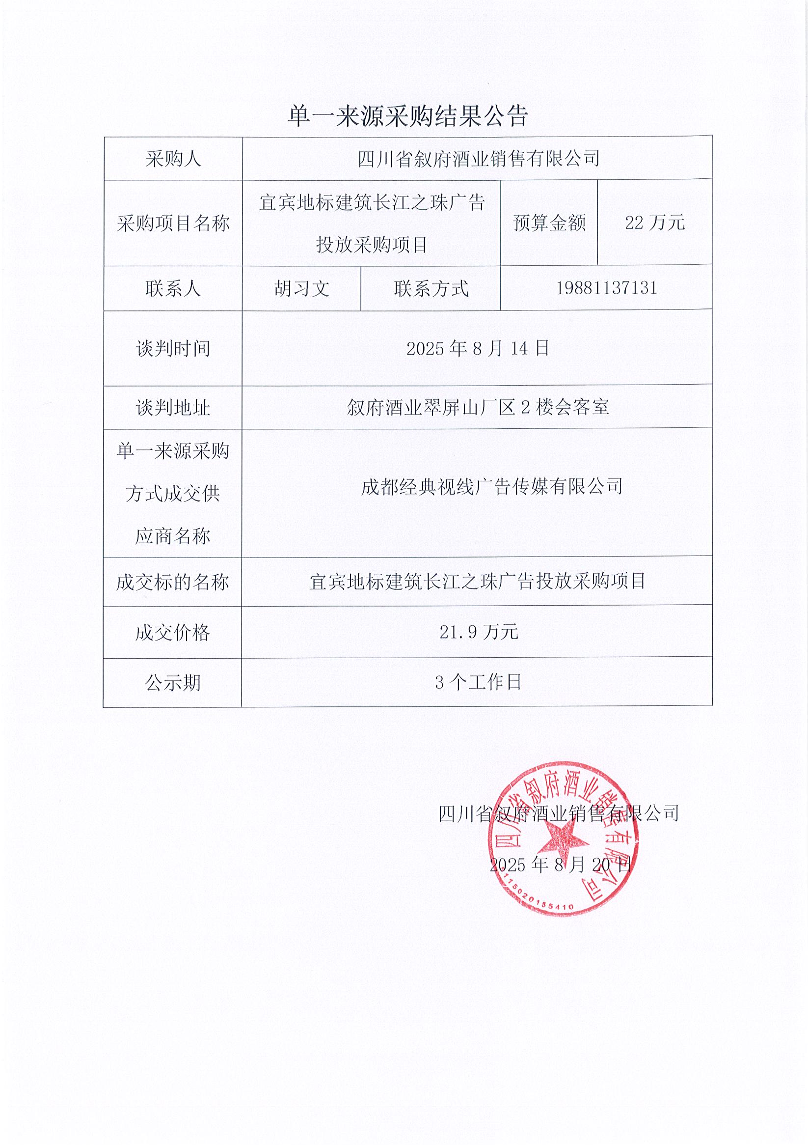 四川省敘府酒業(yè)銷售有限公司宜賓地標(biāo)建筑長江之珠廣告投放采購項(xiàng)目單一來源采購結(jié)果公告