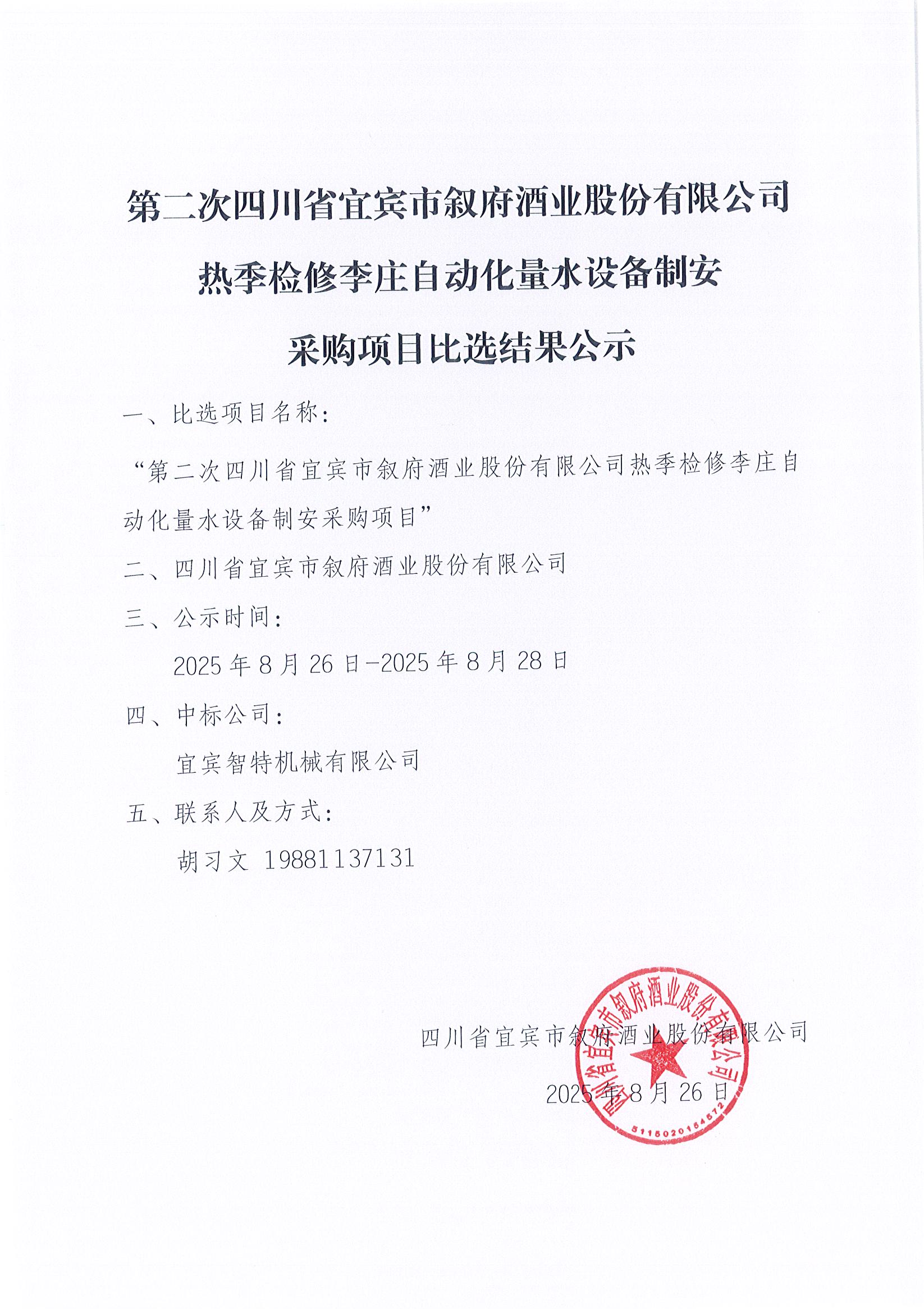 第二次四川省宜賓市敘府酒業(yè)股份有限公司熱季檢修李莊自動(dòng)化量水設(shè)備制公告安采購項(xiàng)目比選結(jié)果公示