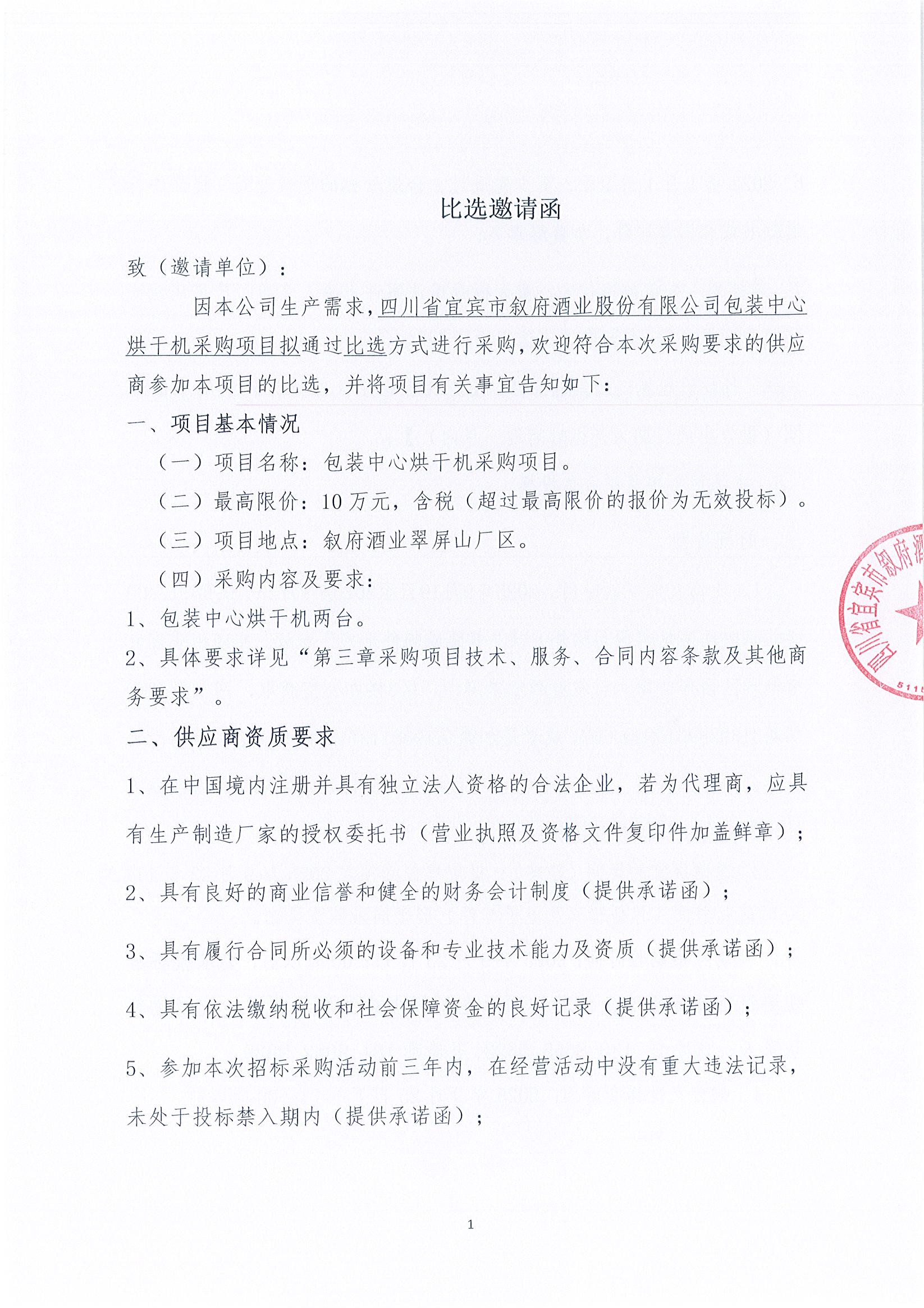四川省宜賓市敘府酒業(yè)股份有限公司包裝中心烘干機(jī)采購項(xiàng)目比選招標(biāo)公示公告