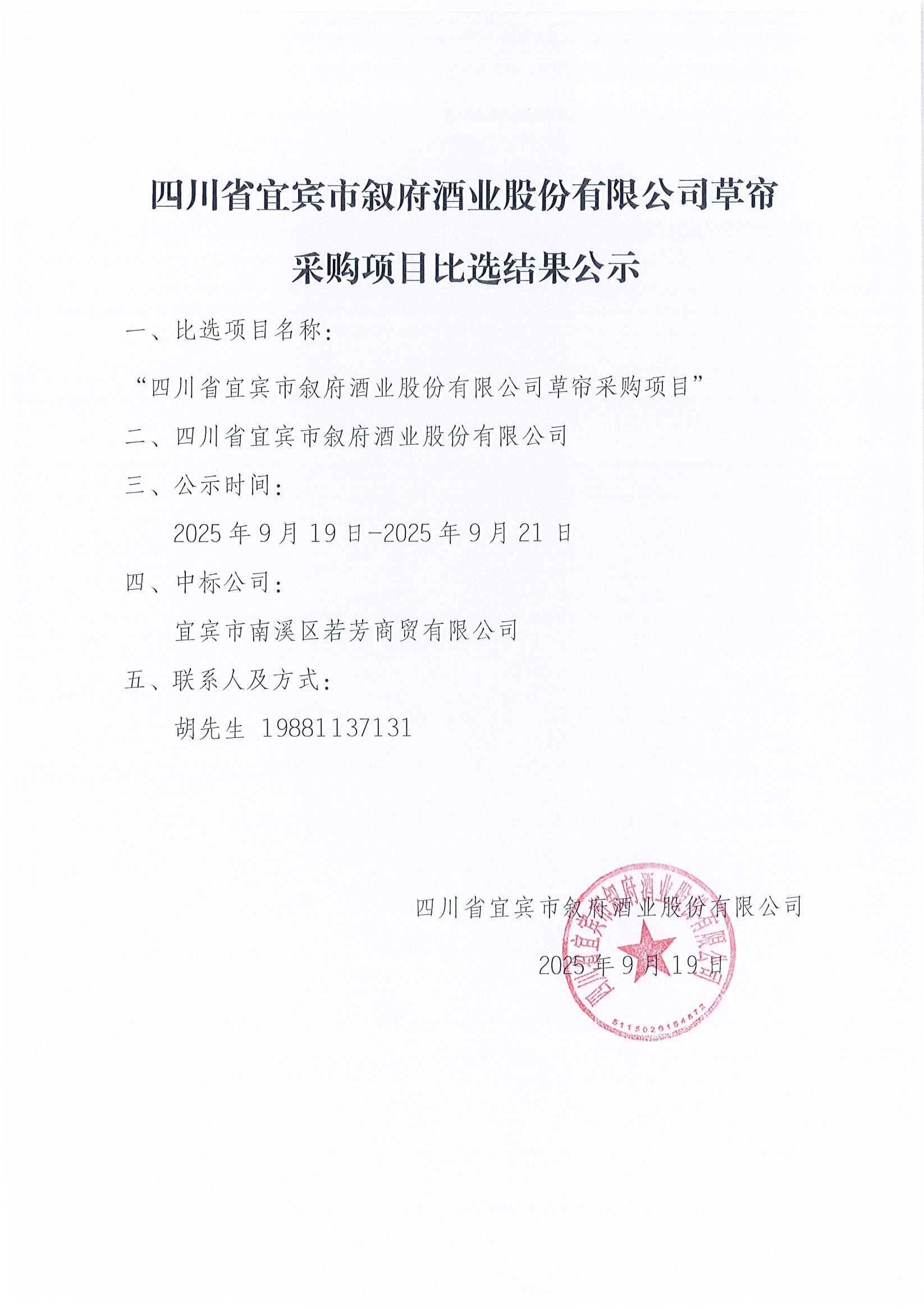 四川省宜賓市敘府酒業(yè)股份有限公司草簾采購項(xiàng)目比選結(jié)果公示