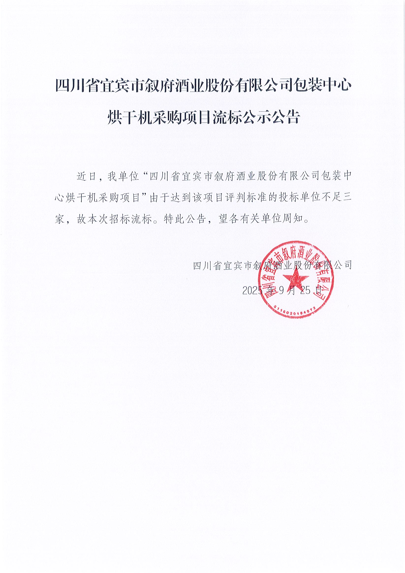 四川省宜賓市敘府酒業(yè)股份有限公司包裝中心烘干機(jī)采購項(xiàng)目流標(biāo)公示公告