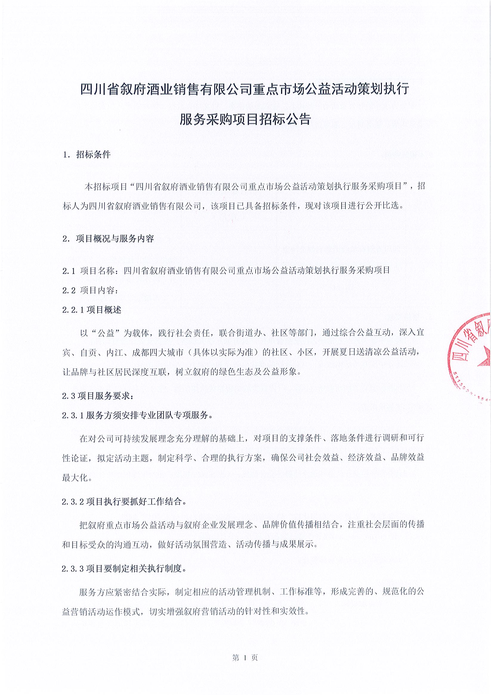 四川省敘府酒業(yè)銷售有限公司重點(diǎn)市場公益活動策劃執(zhí)行服務(wù)采購項目招標(biāo)公告