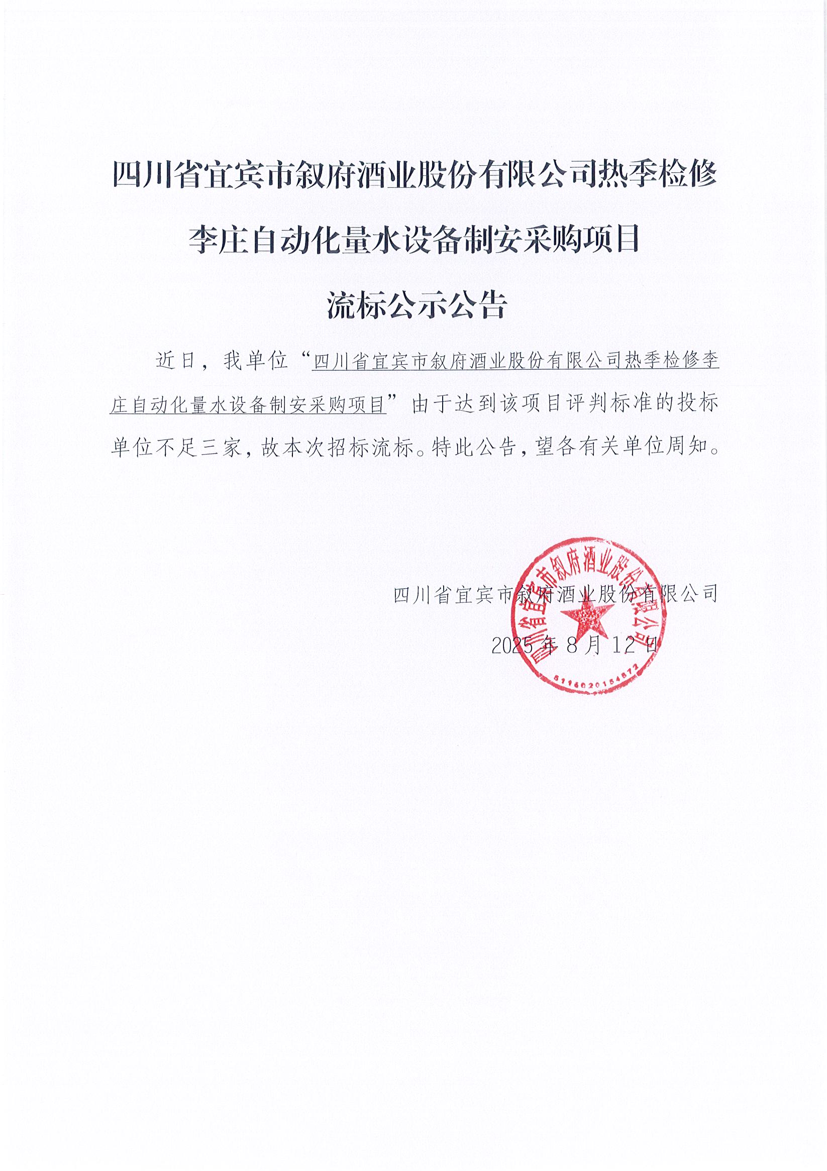 四川省宜賓市敘府酒業(yè)股份有限公司熱季檢修李莊自動化量水設(shè)備制安采購項目流標(biāo)公示公告
