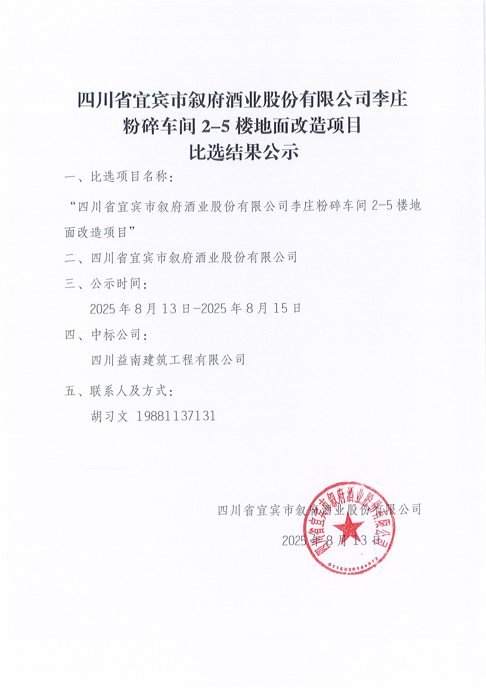 四川省宜賓市敘府酒業(yè)股份有限公司李莊粉碎車間2-5樓地面改造項目比選結(jié)果公告