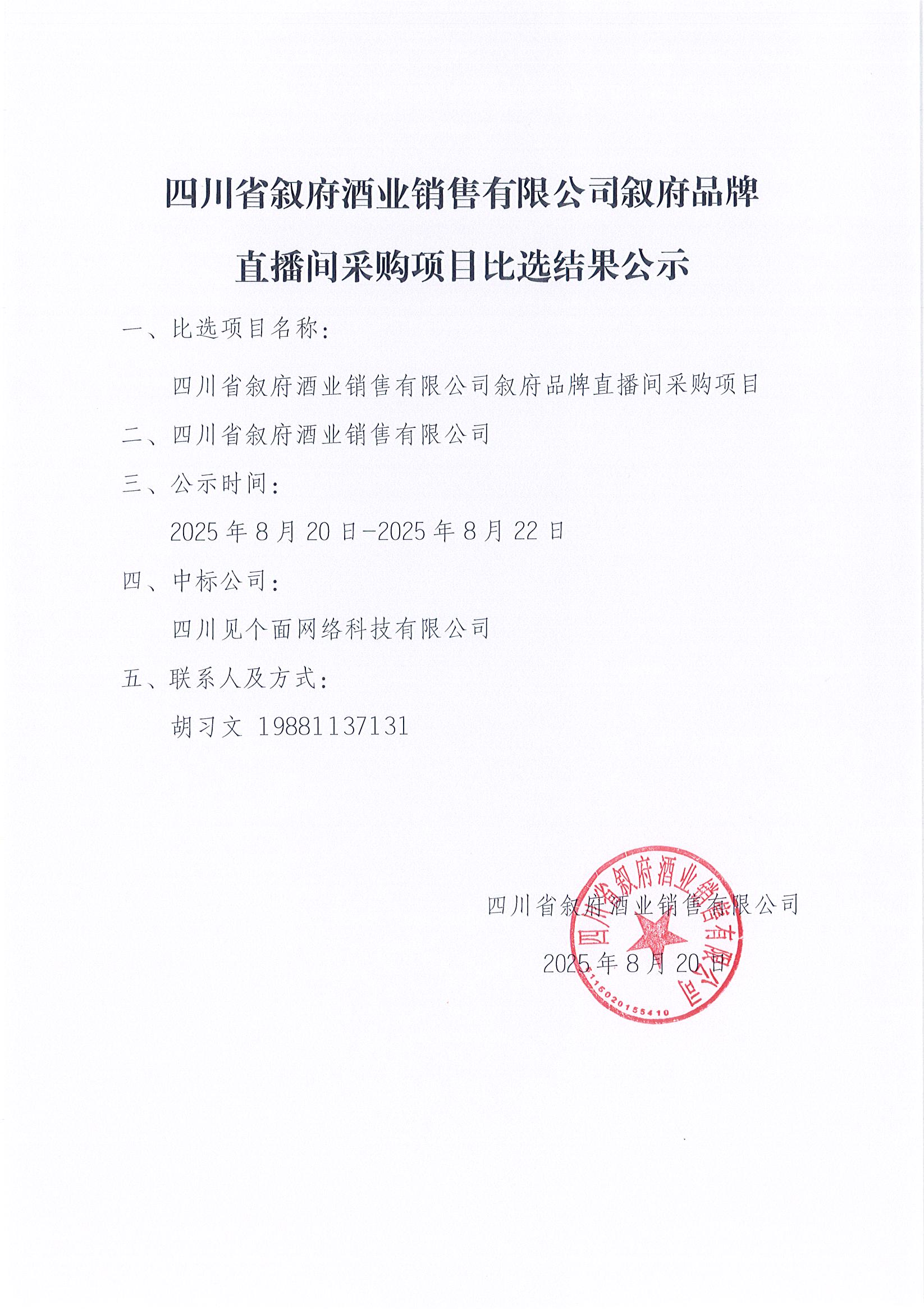第二次四川省宜賓市敘府酒業(yè)股份有限公司2025年熱季檢修采購項目比選結(jié)果公示