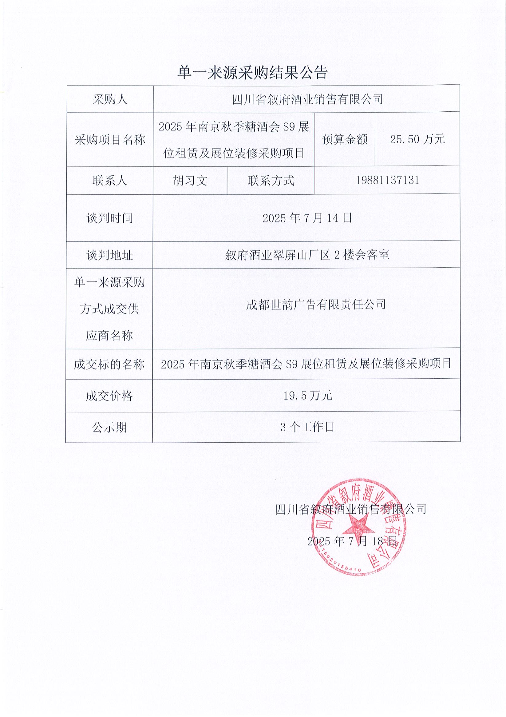四川省敘府酒業(yè)銷售有限公司2025年南京秋季糖酒會(huì)S9展位租賃及展位裝修采購(gòu)項(xiàng)目結(jié)果公示公告