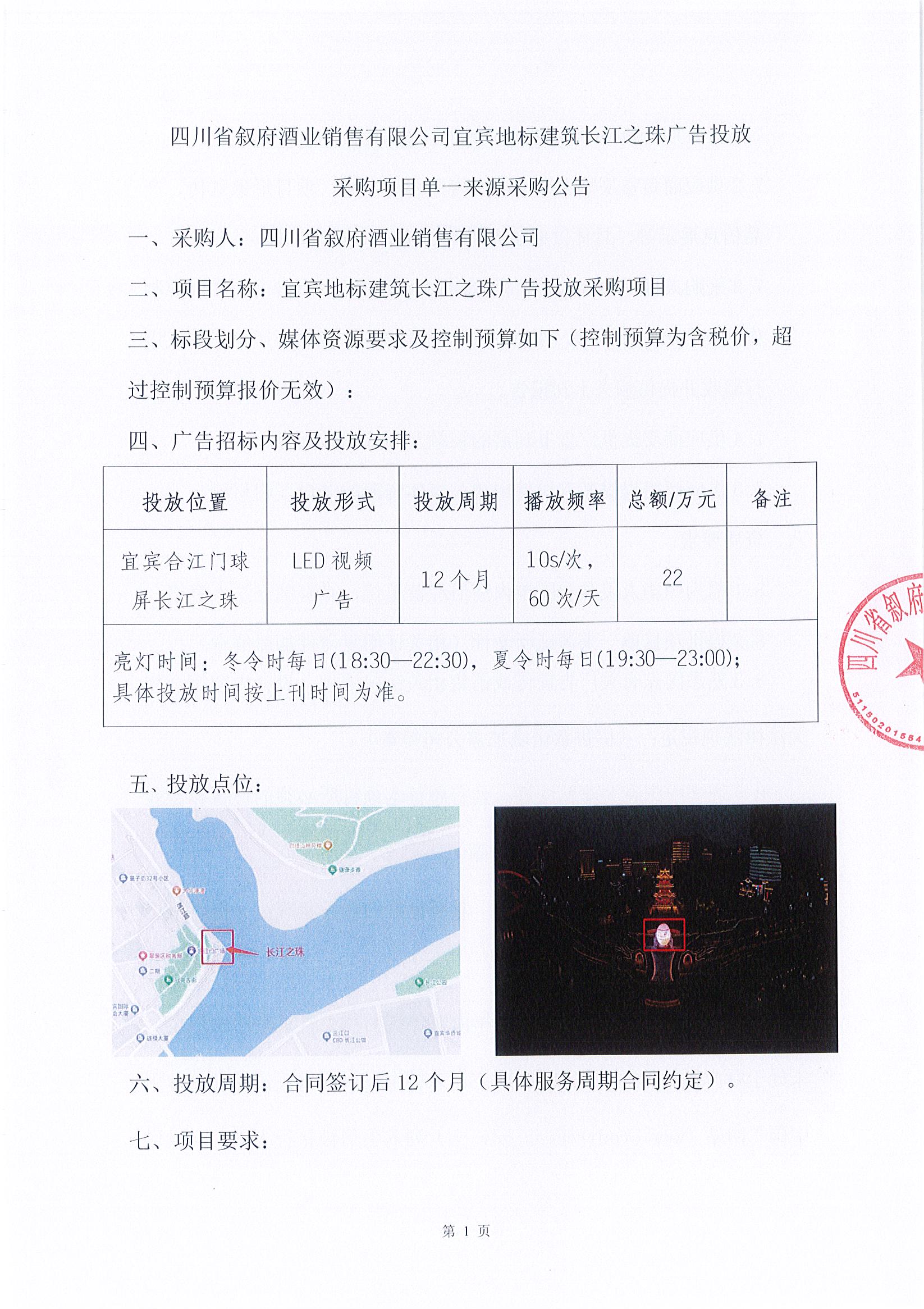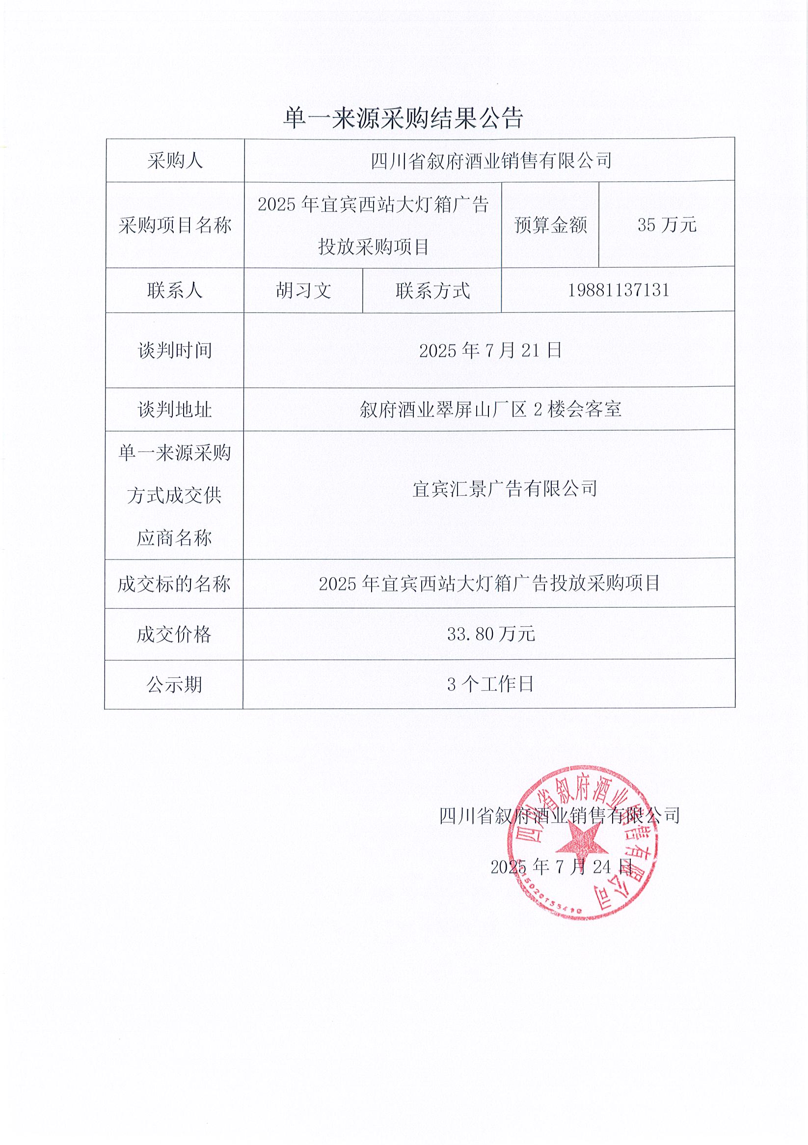 四川省敘府酒業(yè)銷售有限公司2025年宜賓西站大燈箱廣告投放采購(gòu)項(xiàng)目單一來(lái)源采購(gòu)結(jié)果公示公告