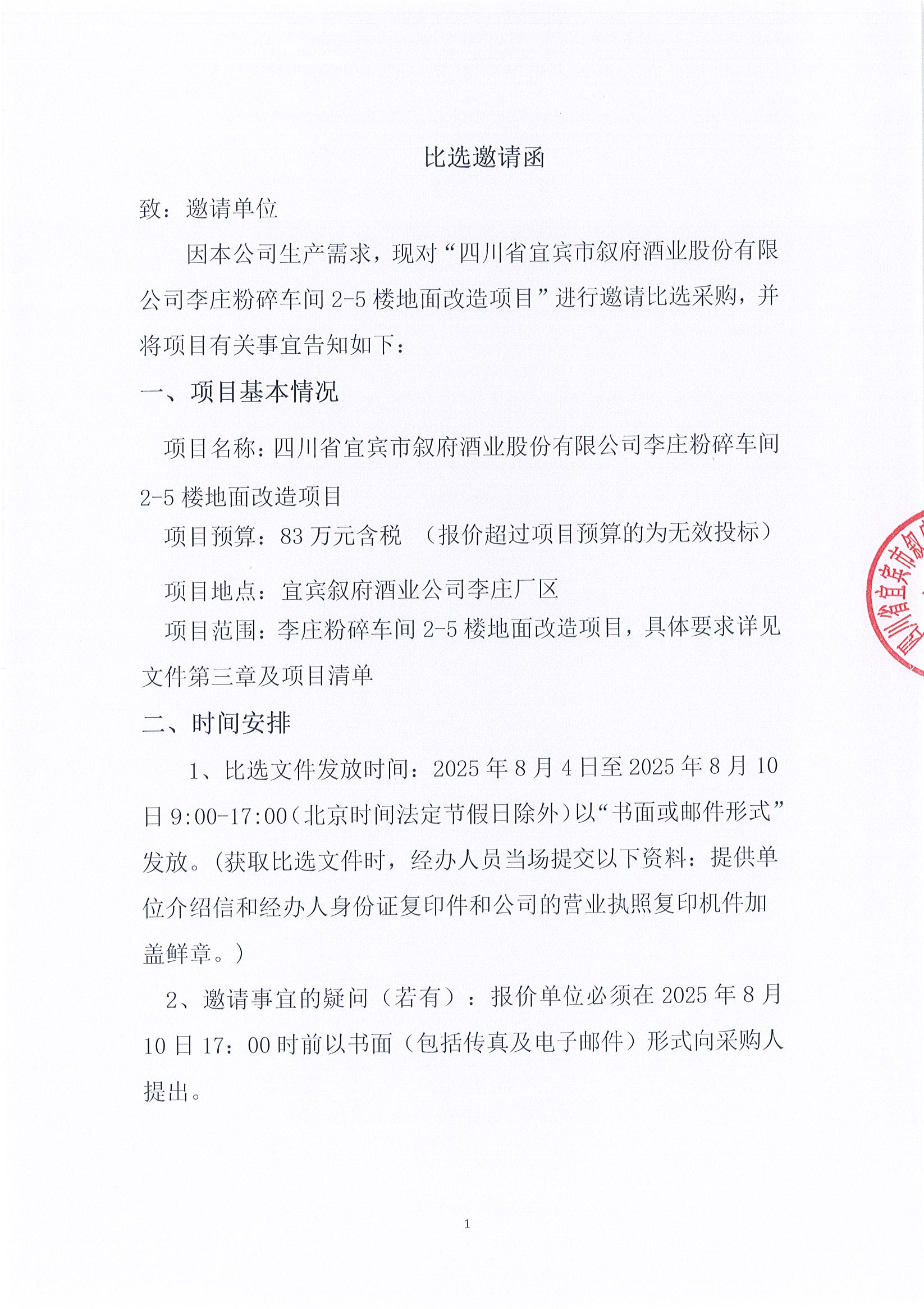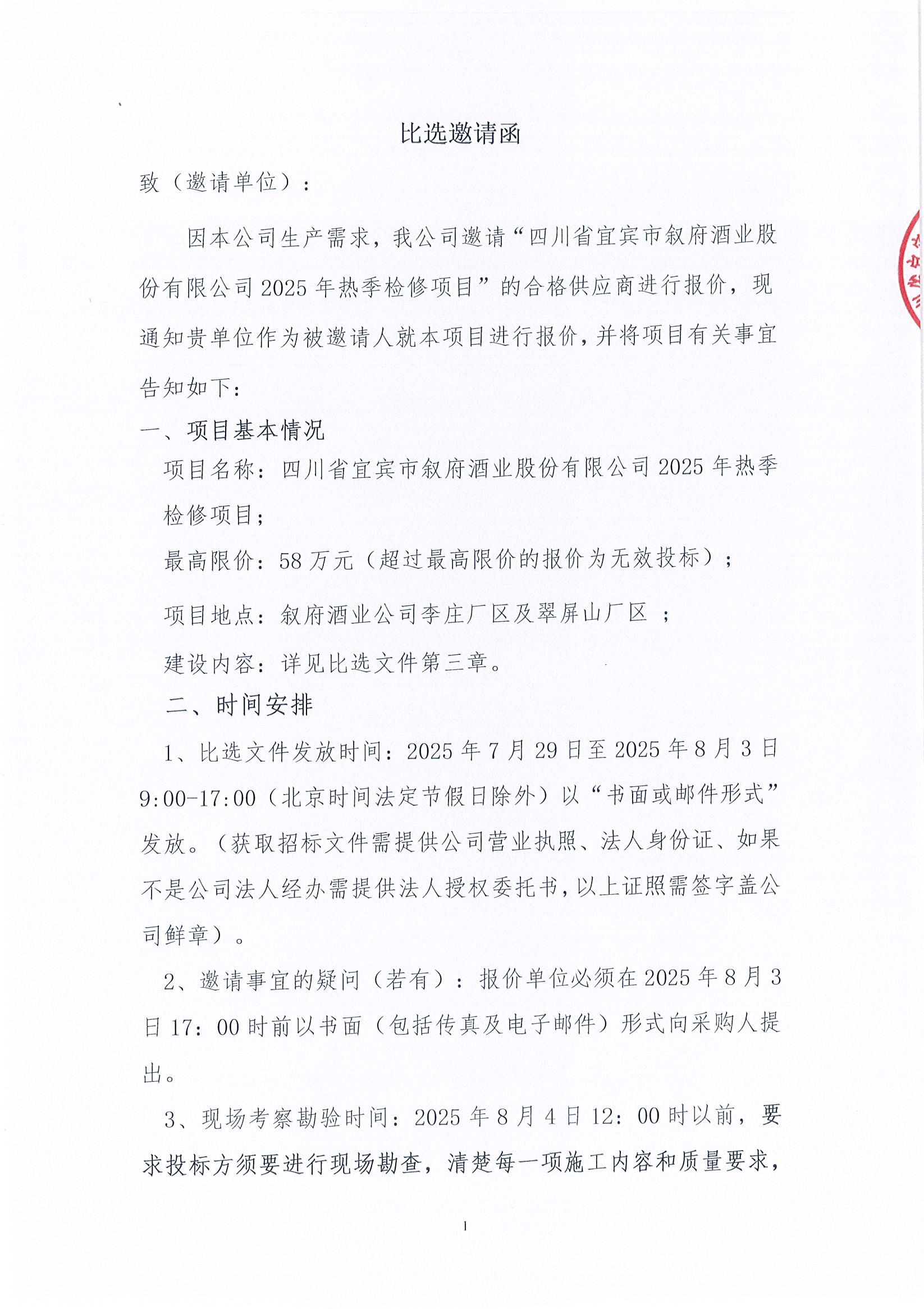 四川省宜賓市敘府酒業(yè)股份有限公司2025年熱季檢修項(xiàng)目公開比選招標(biāo)公告