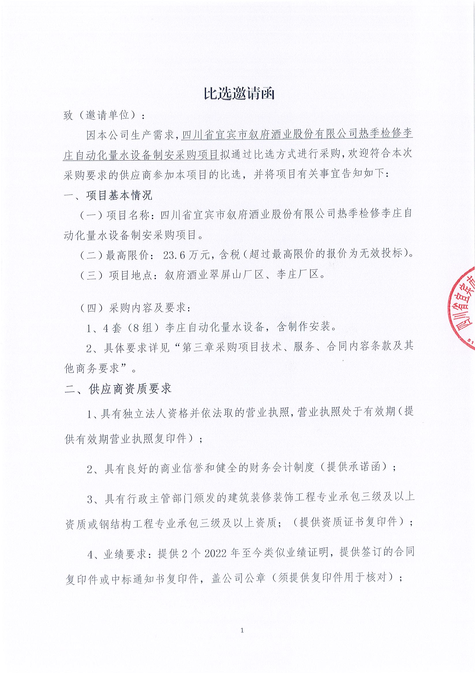 四川省宜賓市敘府酒業(yè)股份有限公司熱季檢修李莊自動(dòng)化量水設(shè)備制安采購(gòu)項(xiàng)目招標(biāo)公告