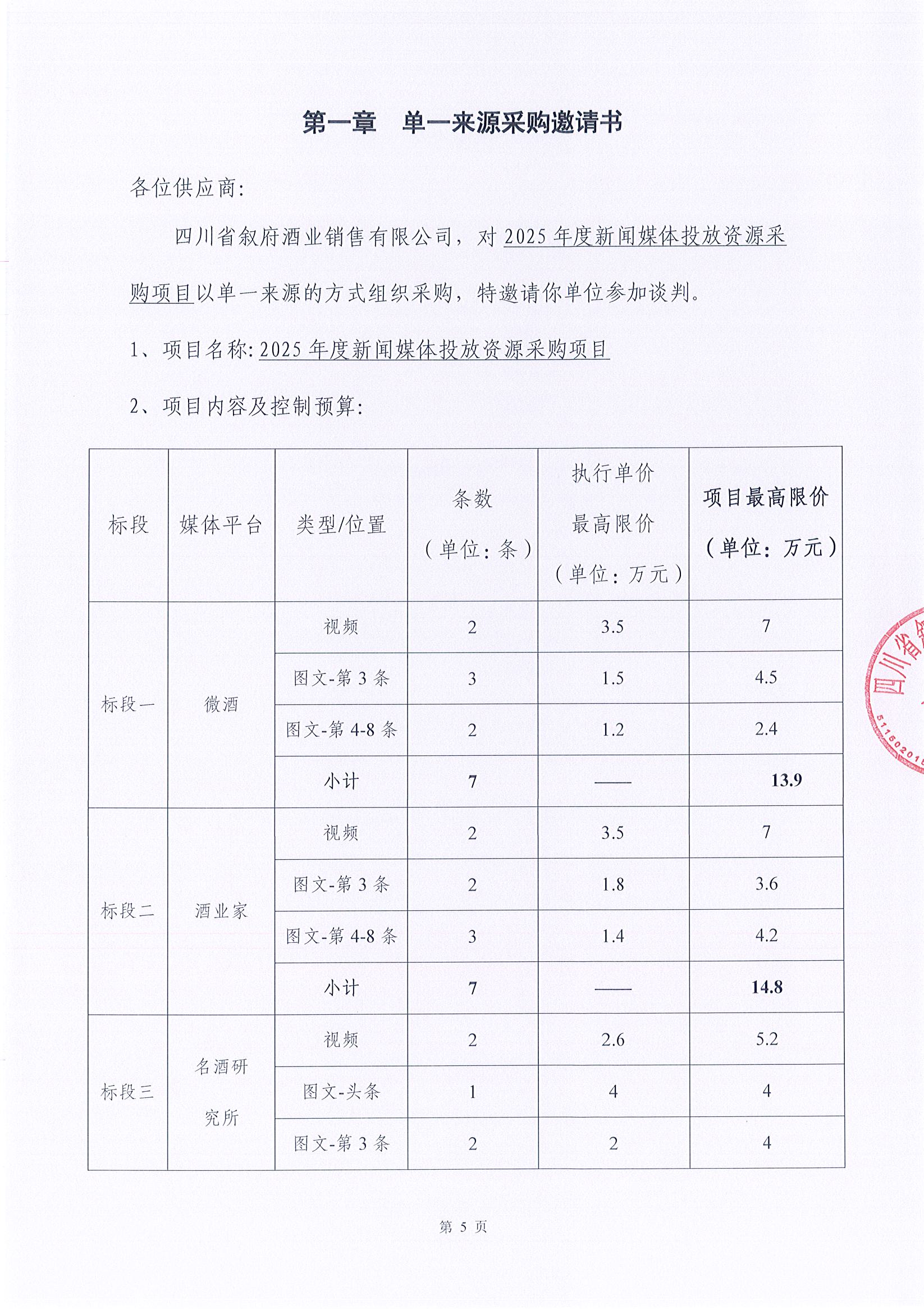 四川省敘府酒業(yè)銷售有限公司2025年度新聞媒體投放資源采購項目單一來源采購邀請書