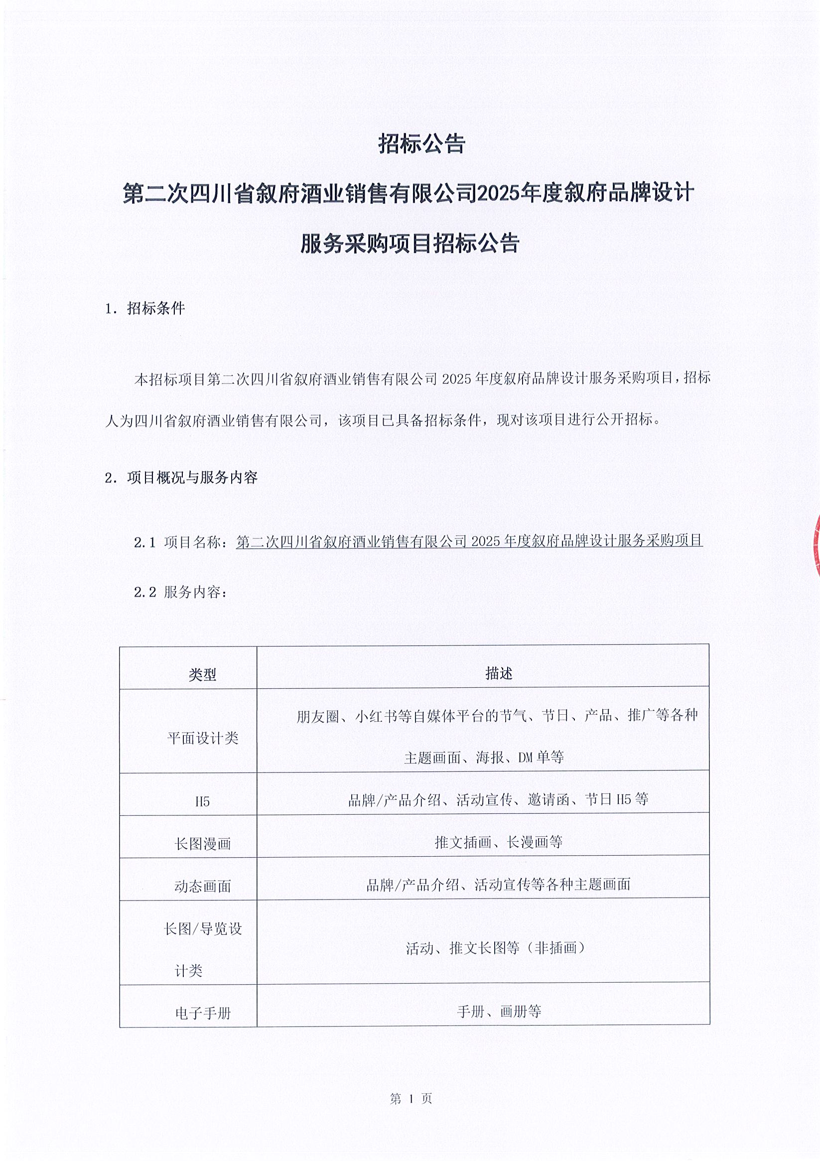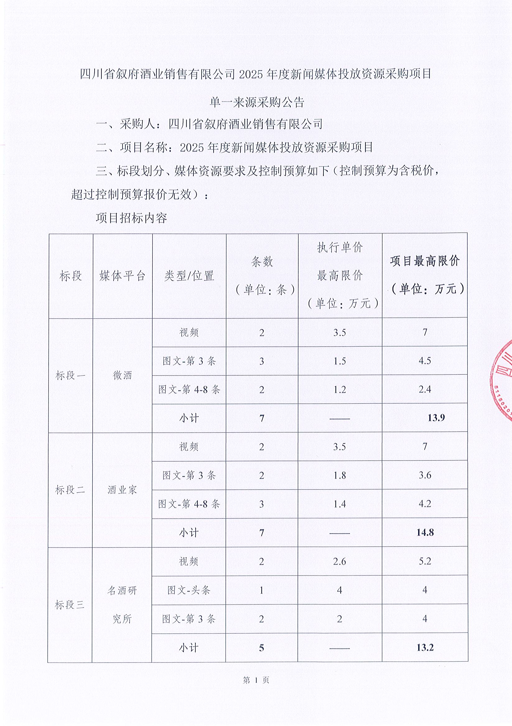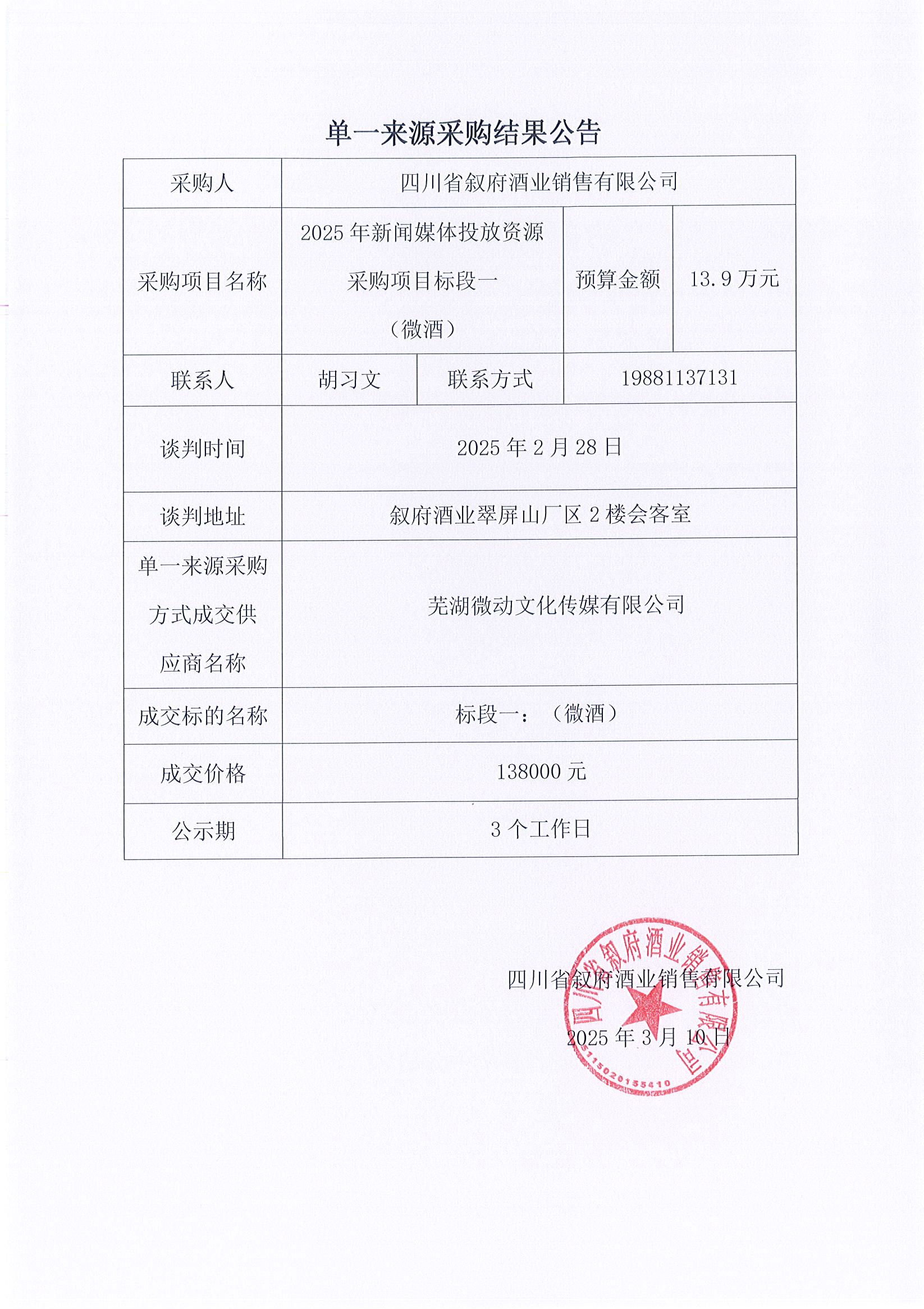 四川省敘府酒業(yè)銷售有限公司2025年度 新聞媒體投放資源采購項目單一來源各標(biāo)段中標(biāo)結(jié)果公示公告