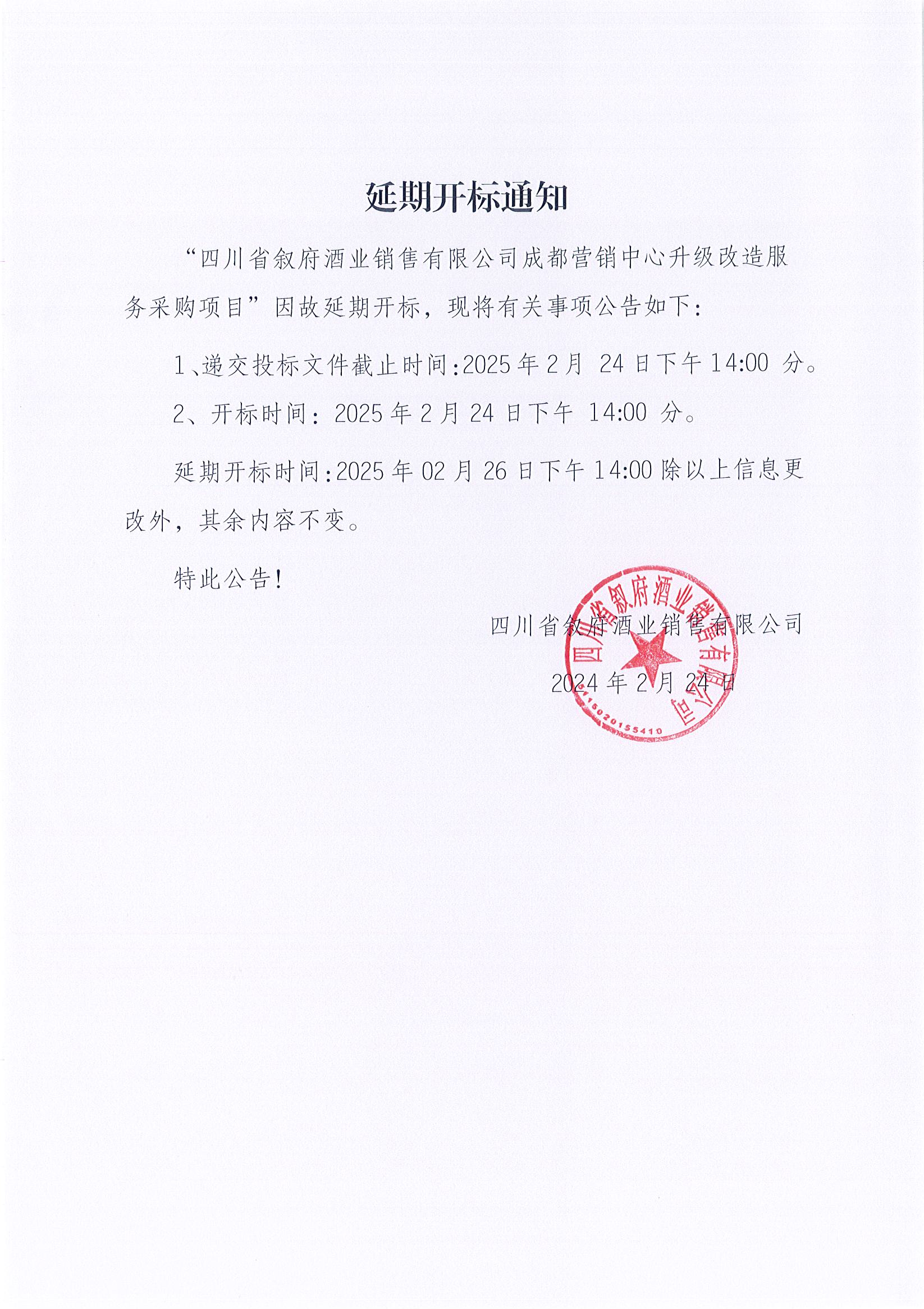 四川省敘府酒業(yè)銷售有限公司成都營銷中心升級改造服務(wù)采購項目延期開標(biāo)通知