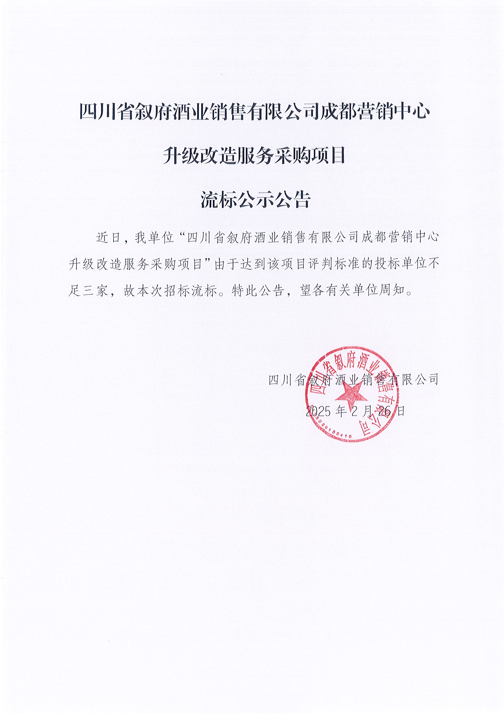 四川省敘府酒業(yè)銷售有限公司成都營銷中心升級改造服務(wù)采購項目流標(biāo)公示公告