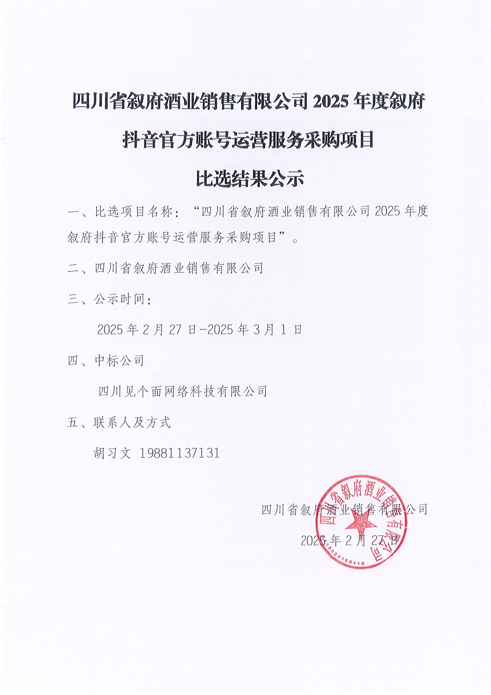 四川省敘府酒業(yè)銷售有限公司2025年度敘府抖音官方賬號運營服務(wù)采購項目公開比選結(jié)果公示公告
