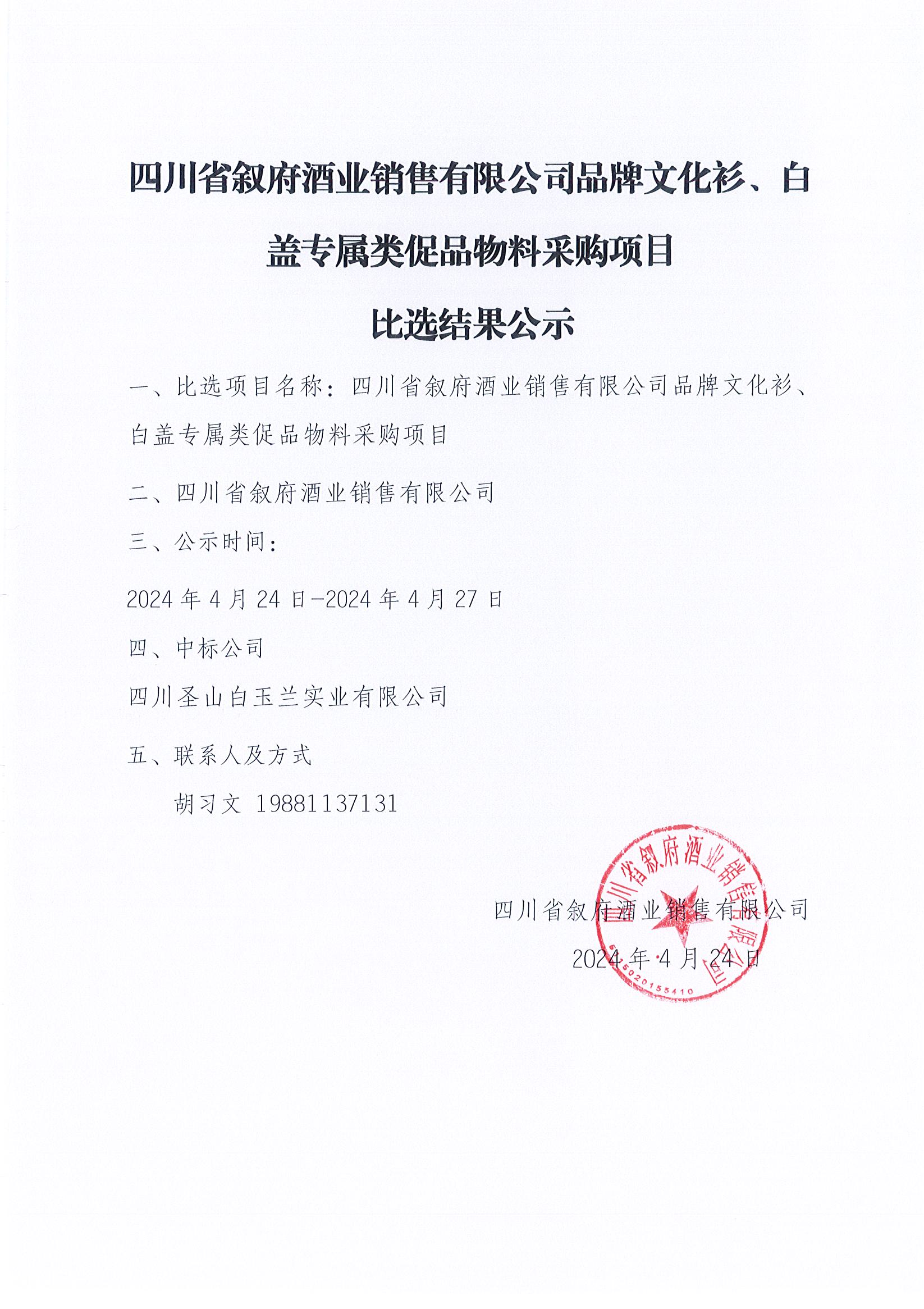 四川省敘府酒業(yè)銷售有限公司品牌文化衫、白蓋專屬類促品物料采購項(xiàng)目比選公告