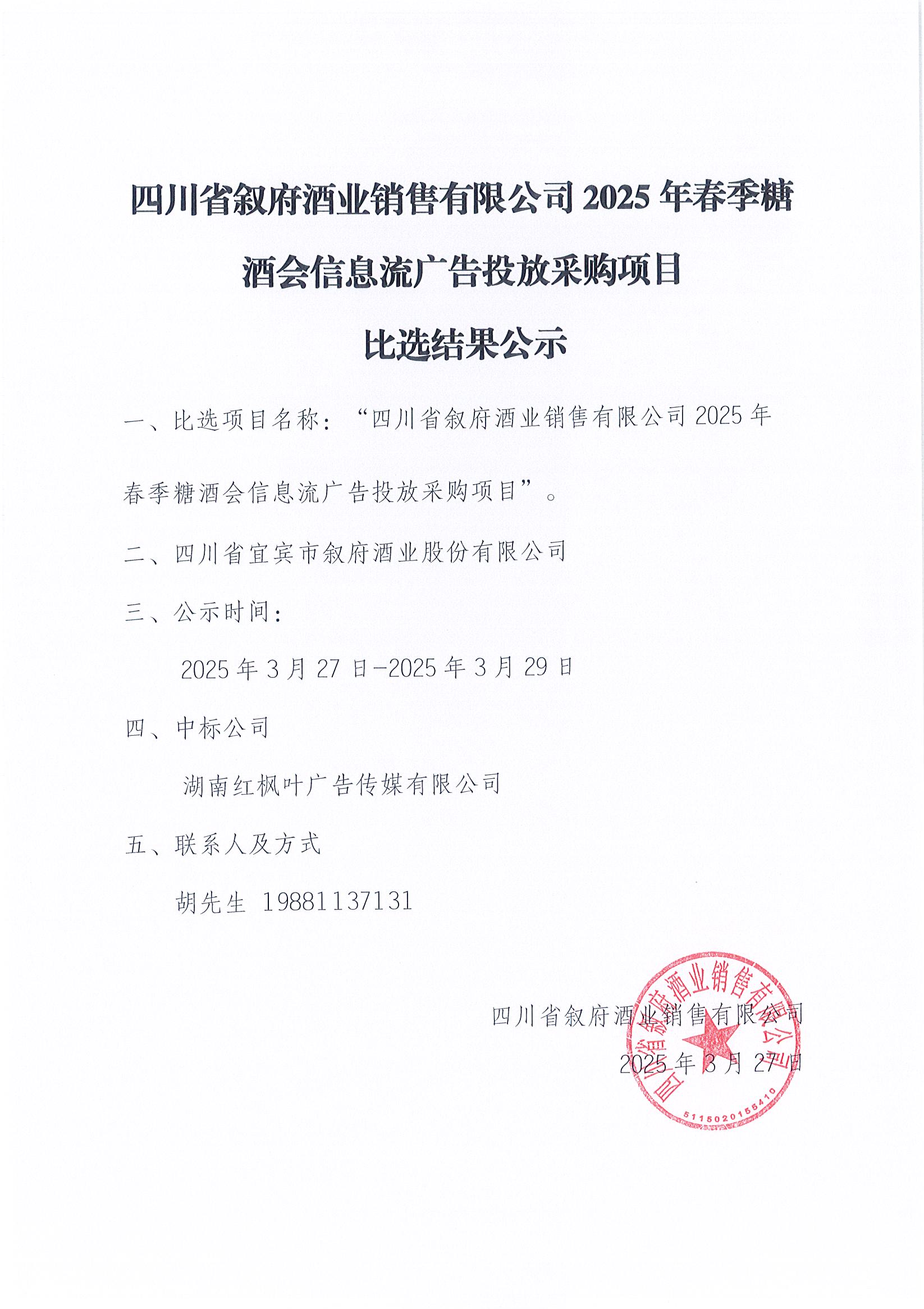 第二次四川省敘府酒業(yè)銷售有限公司成都營銷中心升級改造服務(wù)采購項目比選結(jié)果公示