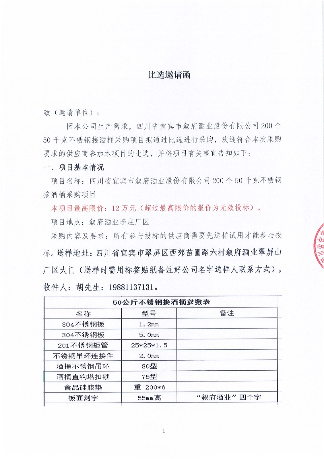 四川省宜賓市敘府酒業(yè)股份有限公司200個(gè)50千克不銹鋼接酒桶采購項(xiàng)目流標(biāo)公示公告
