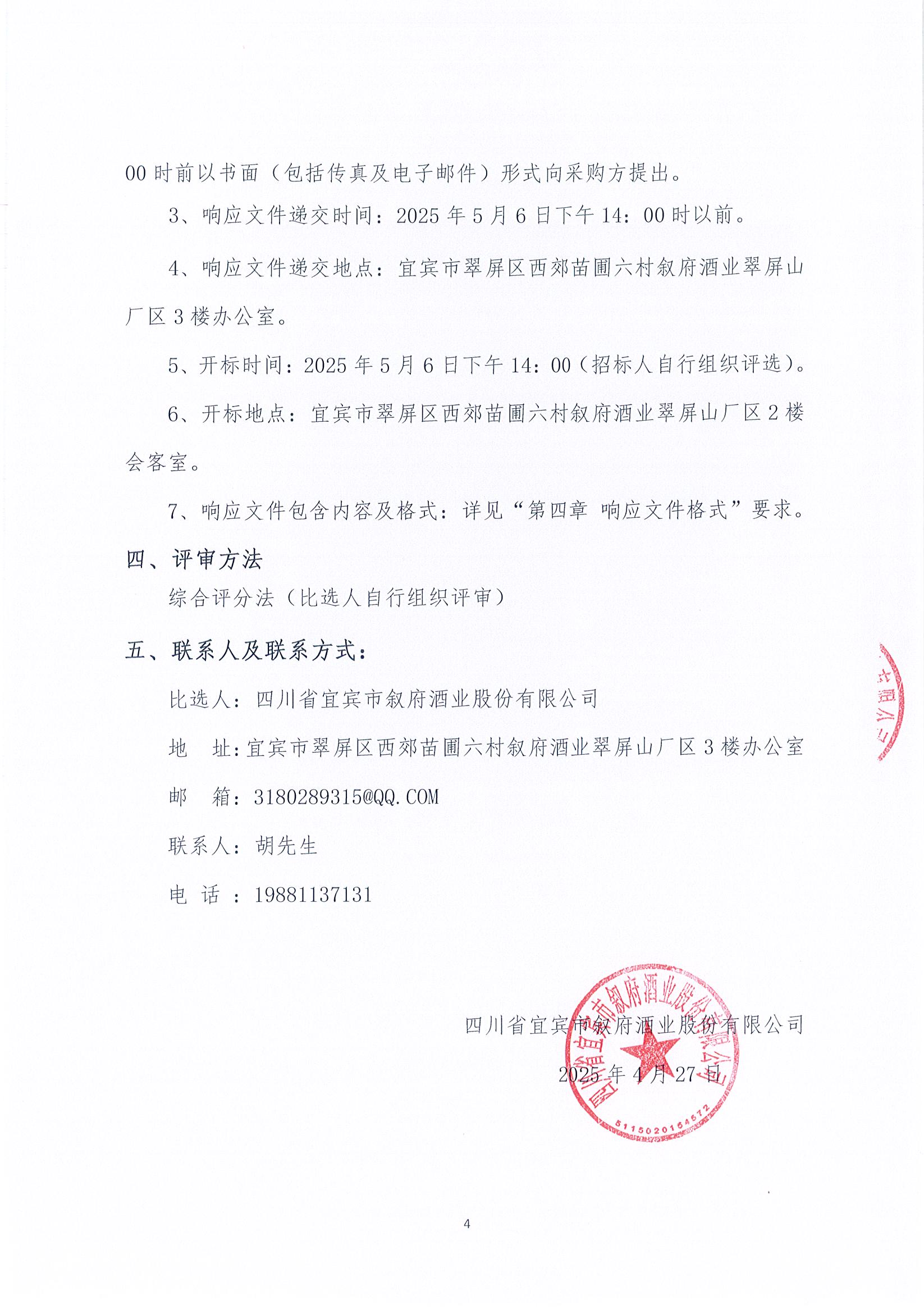 四川省宜賓市敘府酒業(yè)股份有限公司李莊陶壇安裝配套輸酒管道及噴淋系統(tǒng)采購項(xiàng)目比選結(jié)果公告