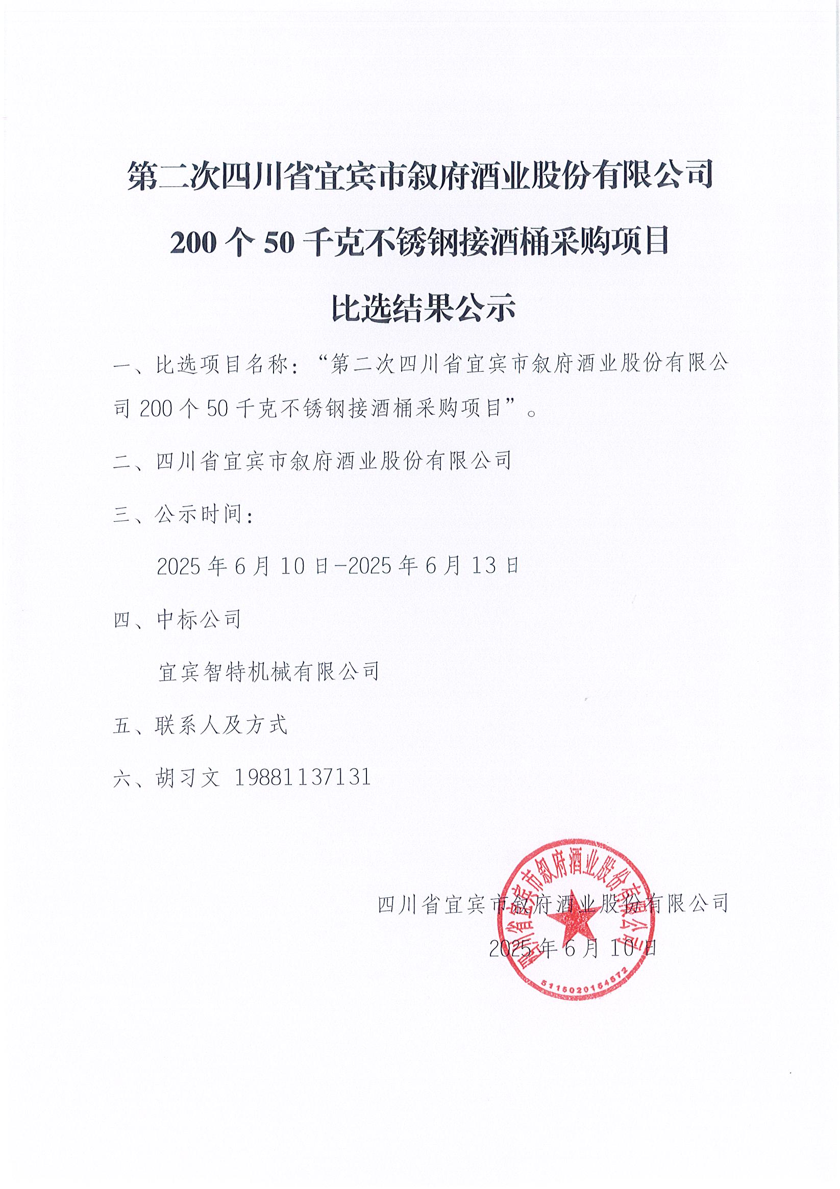 四川省宜賓市敘府酒業(yè)股份有限公司2025年員工體檢服務(wù)采購項(xiàng)目公開比選結(jié)果公示