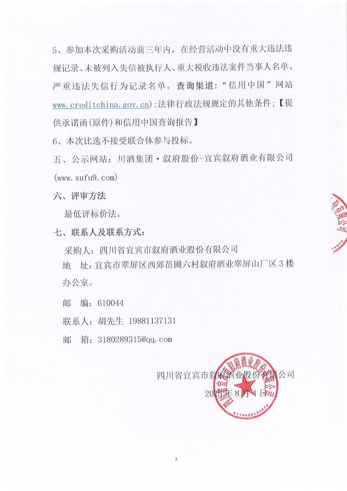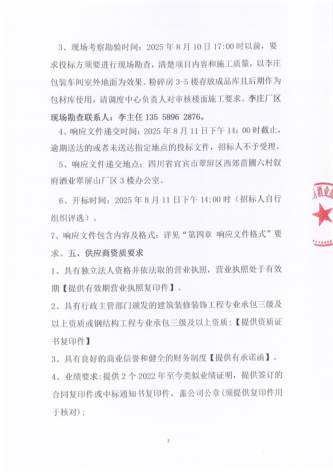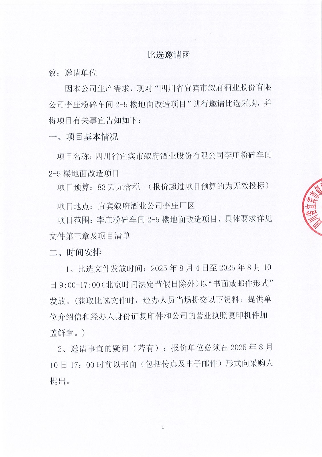 四川省宜賓市敘府酒業(yè)股份有限公司2025年熱季檢修項(xiàng)目公開比選招標(biāo)公告
