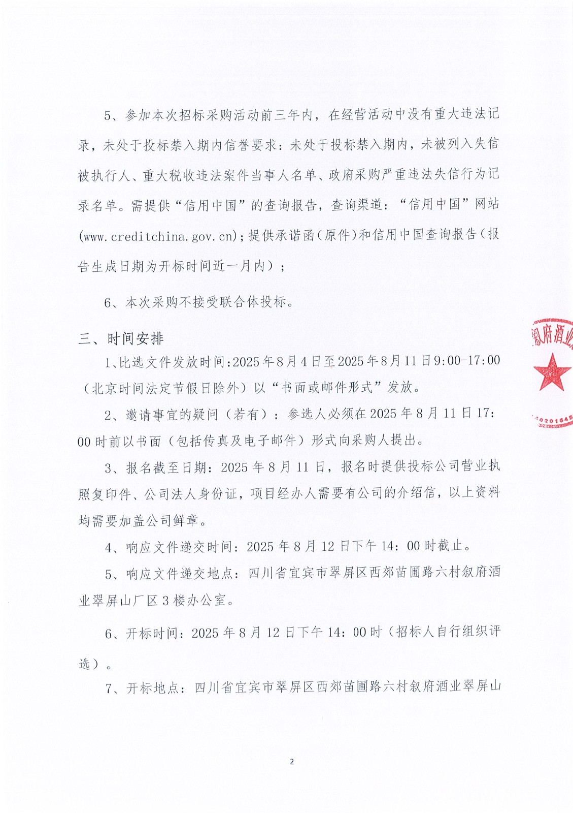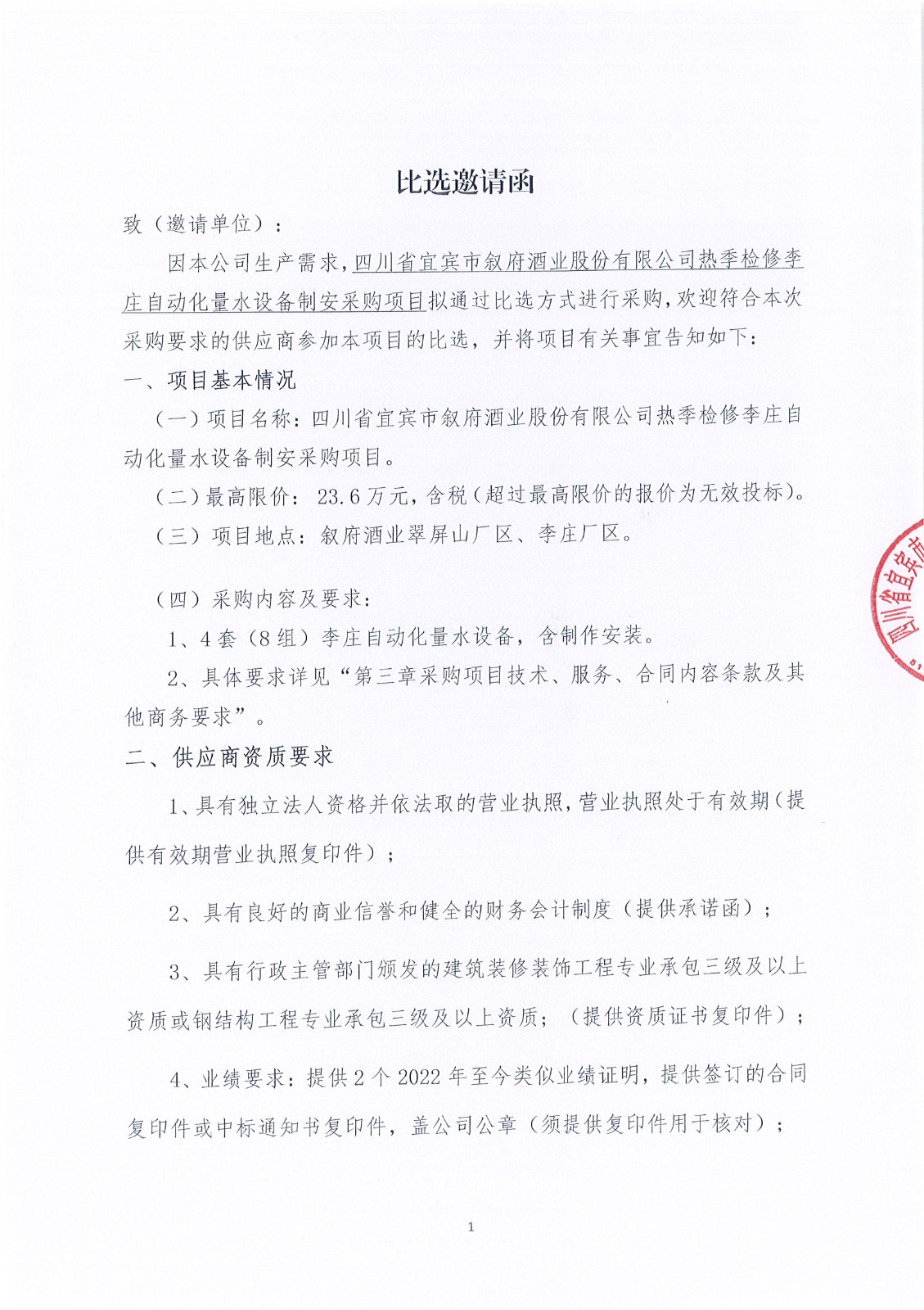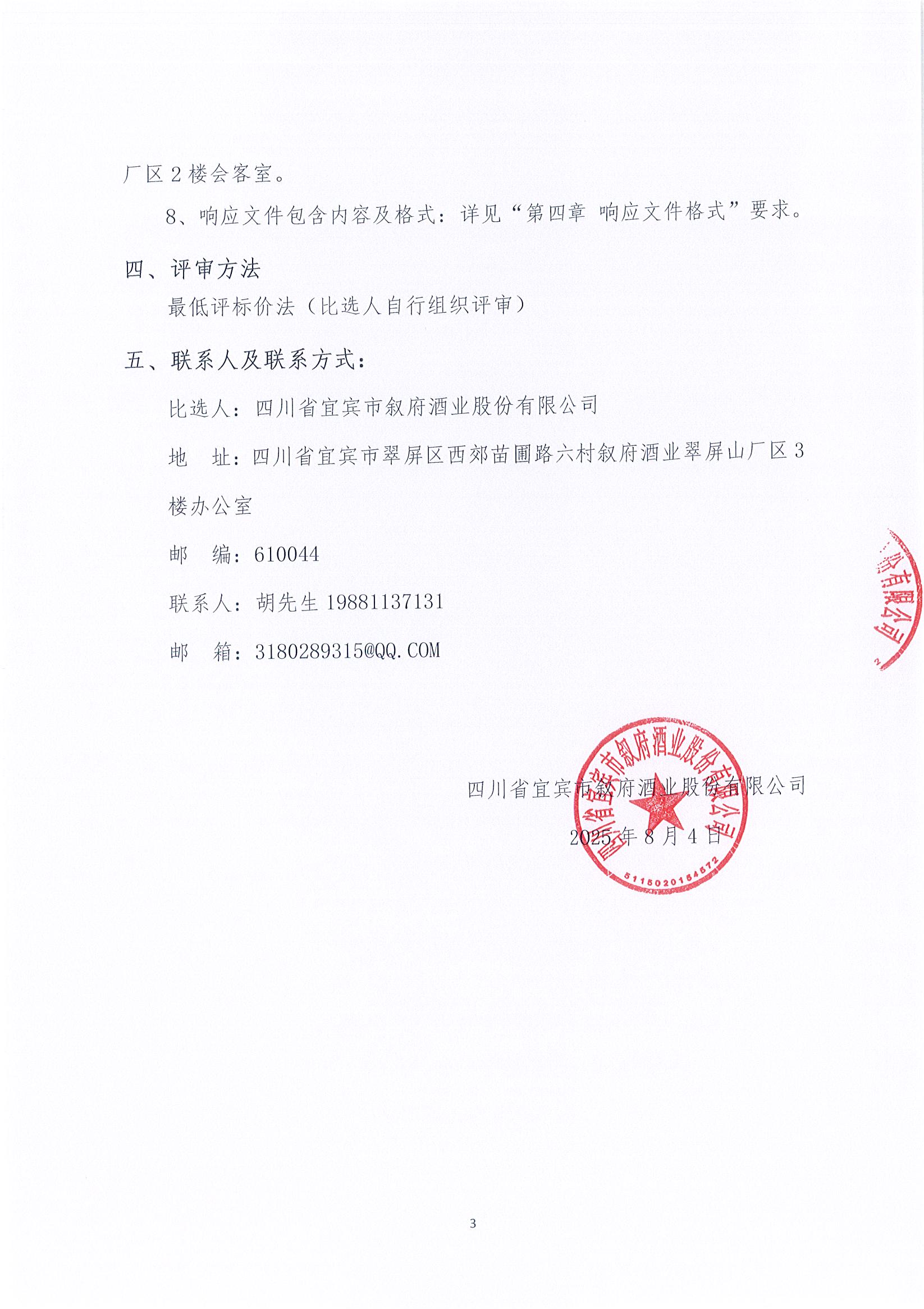 四川省宜賓市敘府酒業(yè)股份有限公司2025年熱季檢修項目流標公告